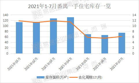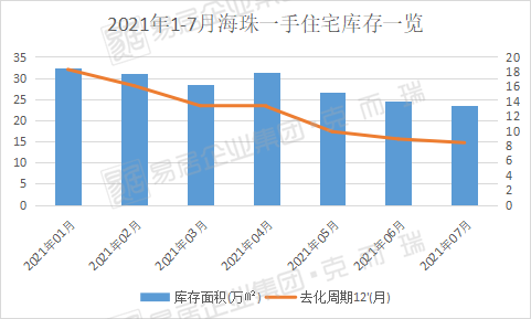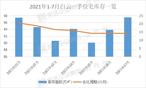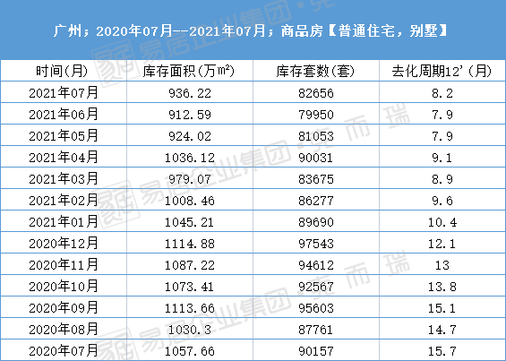 据克而瑞数据显示,截至7月底,广州一手住宅库存总量为936.22万平,共计82656套,同比下滑8.3%,去化周期较去年同期明显缩短。但要注意的是,去年受疫情影响,楼市整体表现疲软,才出现如此长的去化周期。
