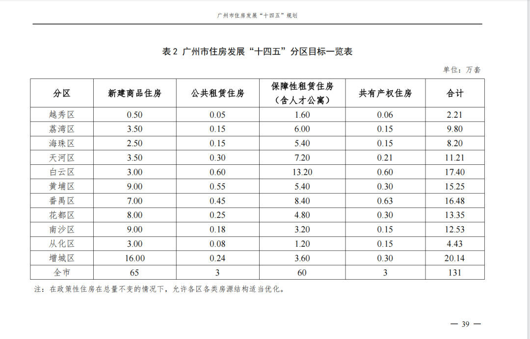 “十四五”规划提到:广州新增新建商品住房供应力争达到65万套,同时,针对未来五年的土地供应,十四五规划也按照各区的去化周期划了分界线。