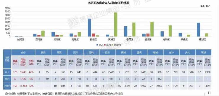 另外,广州全市已签约/已签意向旧改项目183个,番禺、增城、黄埔旧改规模位列三甲,其中番禺区以9145万㎡领跑全市;参与城市更新房企&联合体共有86家。