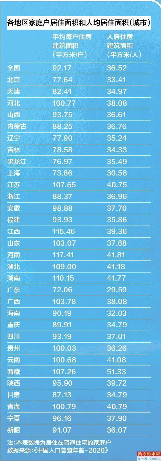 全国家庭户人均居住面积:2020年,全国共有家庭户4.65亿户。在31个省份中,广东的家庭户数量最多,达到3895.3万户,其次是山东,家庭户数量为3391.6万户。