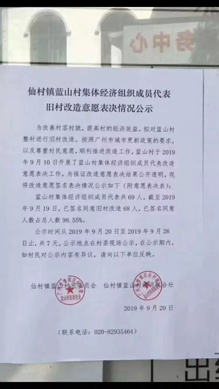9月20日,仙村首条旧改村蓝山村以98.55%旧改意愿通过率正式启动旧改!