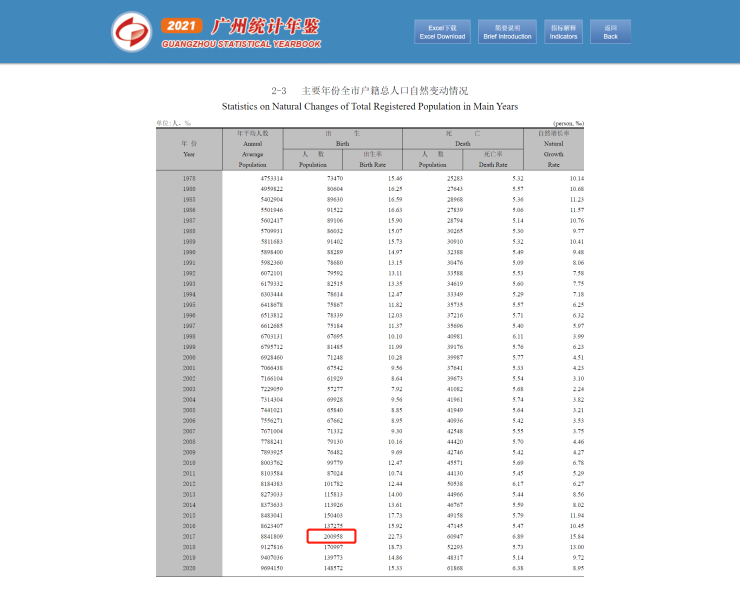 据广州年鉴统计,2017年广州市户籍人口出生人数突破20万,是1978年至2020年的最高峰。
