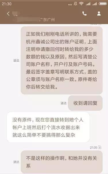 万般无奈之下,卢先生再次联系了W先生和L小姐,拒绝了直接转账到个人账户的无理要求,阐明了款项必须原路退回的立场,并提出需要这家杭州的公司出具的情况说明,将事情原委写清楚并申请索回这笔款。