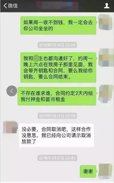 业主当晚又仔细查询了这家联X公司的情况,考虑到租金返还这种异常操作,觉得还是有风险。第二天是周五,下班时业主再三追问了L小姐是否能够在周一(即1月15日)到账,反复确认的过程中,L小姐觉得业主没有给与充分的信任,于是周五傍晚就说:我向公司请示取消放款了。