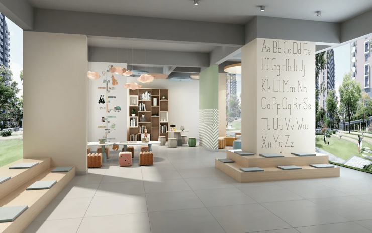洋房的每栋楼首层均打造主题架空层,从“社区文化+全龄化共享”空间入手,形成内外呼应的主题空间,是大人与孩子、邻里互动的纽带。