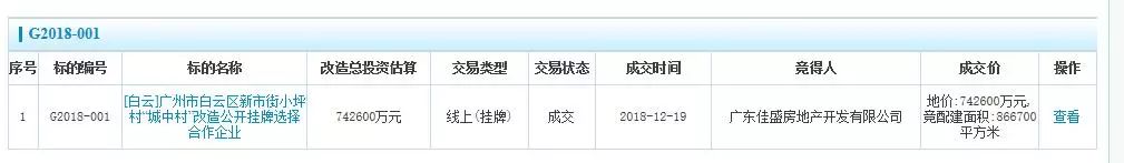 12月19日,广州市白云区新市街小坪村“城中村”改造项目在广州公共资源交易中心竞拍出让,由广东佳盛房地产开发有限公司以742600万元,以及866700平方米竞配建面积竞得。