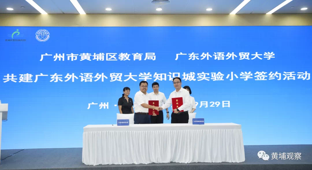 9月29日上午,黄埔区与广东外语外贸大学签订合作办学协议,合作共建广东外语外贸大学知识城实验小学(下简称“广外知识城实验小学”)。