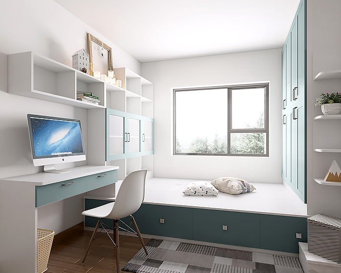 结合飘窗设计榻榻米房,合理利用好空间,书桌和书柜组合设计,书桌底下空间也要利用好,增大收纳空间,书桌柜也能作为梳妆台使用。