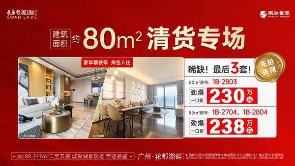 花都标杆豪宅南驰都湖国际,爆燃双十一,约80方豪装户型清货专场,抢藏最后3套,总价约230-238万元/套,拎包入住!