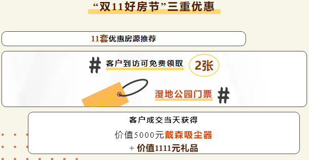 珑璟台推出“双十一好房节”三重优惠,精选11套优惠房源、客户到访可免费领取2张湿地公园门票、成交当天可获价值5000元的戴森吸尘器+价值1111元礼品。