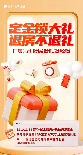 其中11.1-11.11广东保利的全部项目在指定线上平台锁房并交纳房源定金,即可享较高价值5万元的全屋家电礼包。