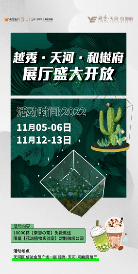 越秀天河和樾府将于明日开放信达金茂广场城市展厅,届时一万份奶茶免费送,还有限量定制好礼,住附近的朋友可以前去打卡。
