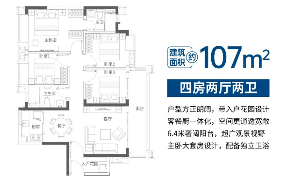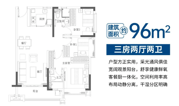 产品为建面约96-107㎡三至四房,户型方正、动静分区,LDK一体化设计、有效拓延活动空间;主卧套房设计,生活更加从容有序。