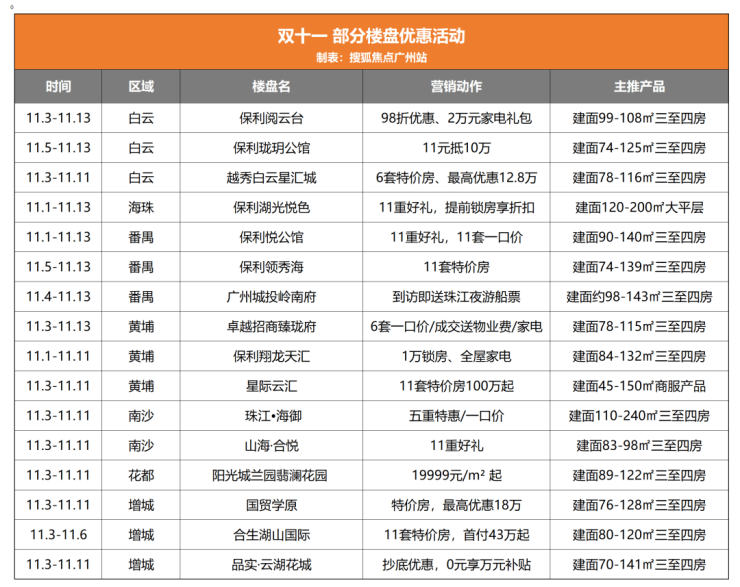 具体到项目,保利珑玥公馆推出11元抵10万购房优惠、保利湖光悦色推出11重好礼及特价房、保利悦公馆推出11套一口价户型、保利领秀海放出11套南向三房两卫户型仅需180万起,保利祥龙天汇推出1万锁房赠送全屋家电活动...