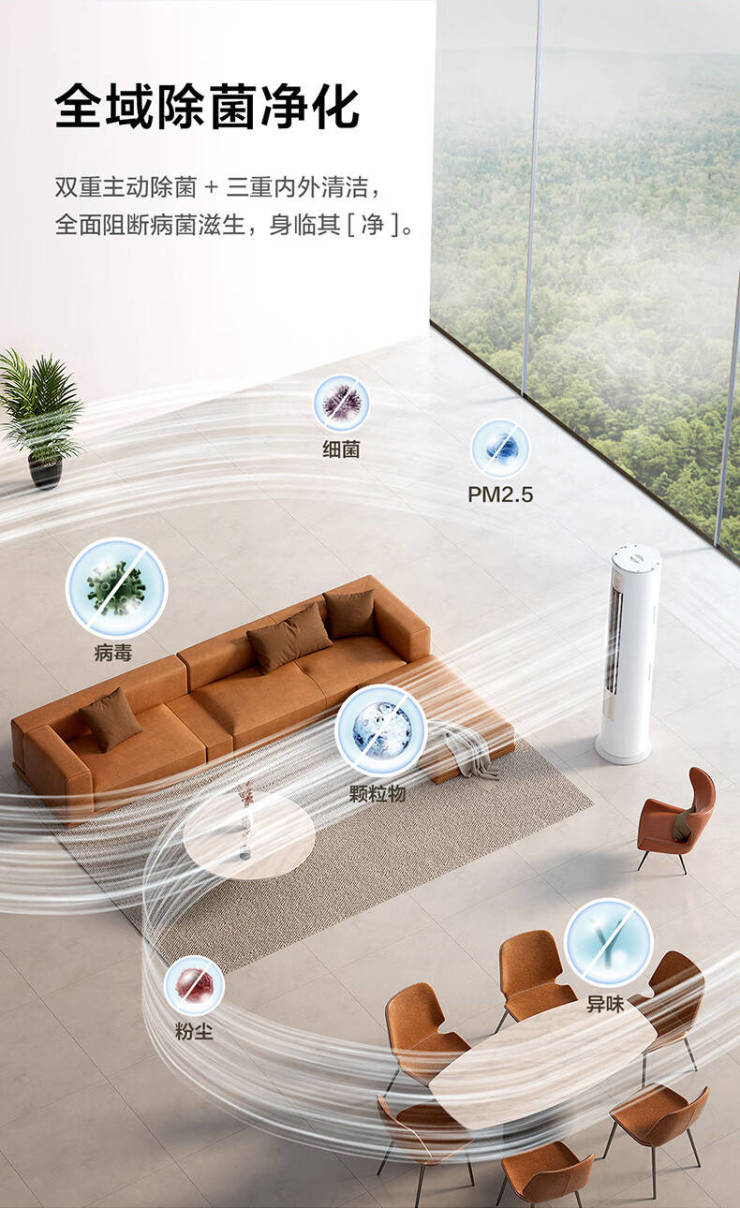 可以说,一键开启除菌功能,位于空调出风口顶部的净离子发生器,释放出净离子,产生高电能破坏细菌细胞膜和病毒蛋白质,分解后还原成水分子,从而实现阻断病菌传播、分解消散异味、防敏降尘的作用,将室内空气中的病毒和细菌一扫而光,再也不用担心室内空气质量不佳危害家人身体健康了。