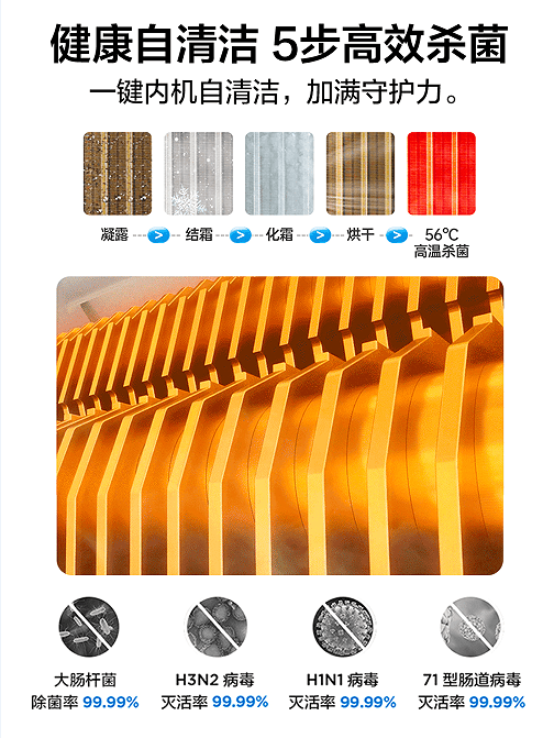 开启自清洁模式后,自动完成“凝露-结霜-化霜-烘干-56°C高温杀菌”五步高温杀菌,长达30min的高温除菌智清洁能有效清除看得见的灰尘、看不见的病菌等,对大肠杆菌、H3N2病毒、H1N1病毒、71型肠道病毒除菌灭活率达到99.99%,彻底拒绝空气二次污染,再也无需担心空调出风不洁净影响健康的问题。