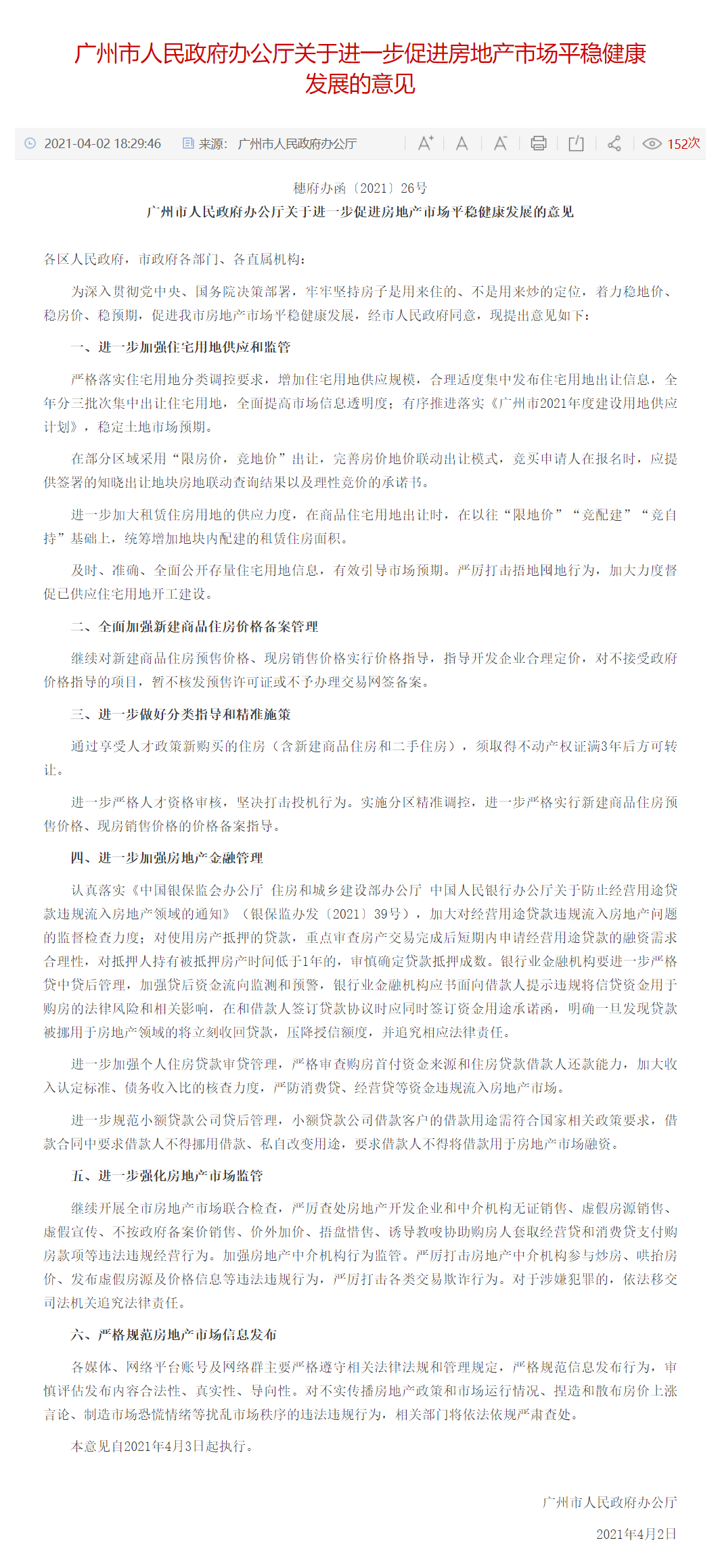 近日,《广州市人民政府办公厅关于进一步促进房地产市场平稳健康发展的意见》正式公布。