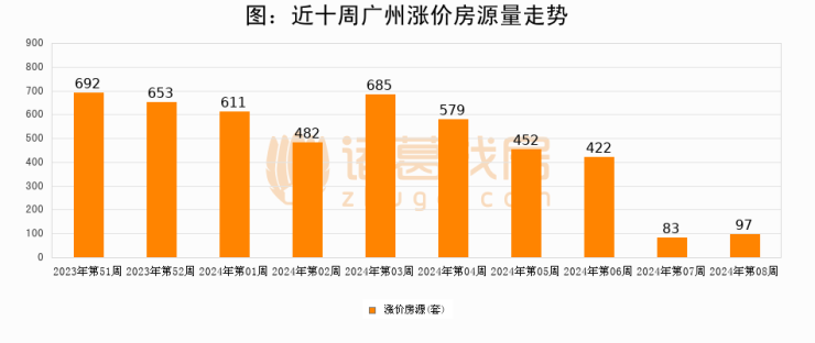 从调价房源来看,第7周广州涨价房源97套,较上周上涨16.9%。与此同时,7周涨价房源占比回落6.34个百分点,业主信心小幅波动,购房者可则需入市。