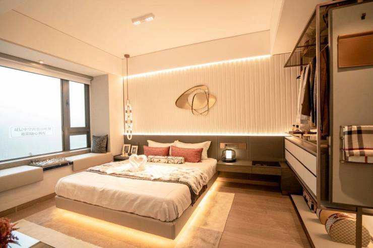约21㎡的主卧大套房功能全面,飘窗+时尚衣帽间+独立卫浴,预留充足空间,宽敞之余更兼私密性,个性品位自成一派。