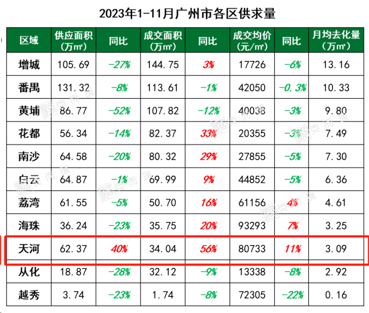 克而瑞数据监测显示,今年1-11月天河商品住宅成交面积34.04万㎡,同比增长56%,成交均价80733元/㎡,同比上涨11%,是全市唯一一个供求量价齐涨的区域。