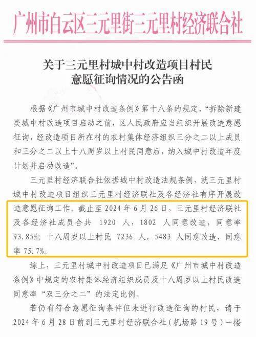 据三元里经济联合社日前发布的《关于三元里村城中村改造项目村民意愿征询情况的公告函》内容,截止至2024年6月26日,三元里村经济联社及各经济社成员合共1920人,1802人同意改造,同意率93.85%;十八周岁以上村民7236人,5483人同意改造,同意率75.7%。