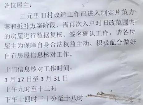 2023年3月,村里发布通知,提及三元里村改造工作已进入制定片策方案和拆补方案阶段,需再次入户对旧改范围内的房屋进行数据复核、签名确认工作。