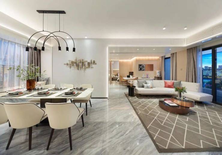 推门入室,一体化餐客厅连接瞰景阳台,勾勒出朗阔通透的空间,直接将整个视觉效果拉满。