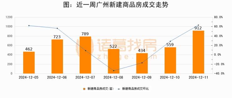 根据广州市住房和城乡建设局数据显示,2024年12月11日广州新建商品房成交912套,较昨日增加353套,环比上涨63.1%
