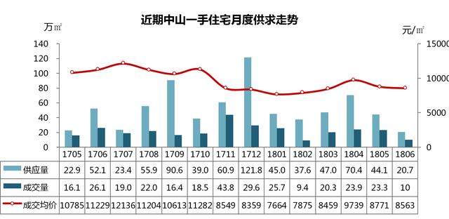 成交均价:6月,中山住宅成交均价8563元/㎡,环比和同比均下跌了,分别下跌2%和24%。由于翡丽花园(1.1万㎡,8559元/㎡)和京珠花园(0.9万㎡,8494元/㎡)等集中成交的项目价格较低,6月成交均价依旧在8字头。