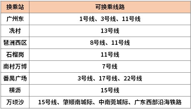 18号线9座车站中有8座换乘站可与既有运营或在建、规划地铁线路换乘。这是截至目前,广州所有地铁路线中,可换乘站点占比高于现时广州的任意一条路线。