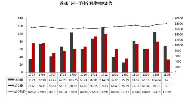 6月(截止6月15日,下同),广州商品住宅供应69万㎡,环比(5月全月,下同)减少34%、同比(2017年6月全月,下同)减少6%。