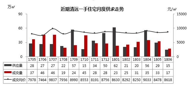 成交方面,6月清城商品住宅成交17万㎡,环比、同比一样减少了,分别减少48%和63%,这究其原因,是碧桂园新亚山湖城(1.9万㎡,178套)、恒大银湖城(0.9万㎡,109套)等成交主力高去化减缓,成交量有所减少,但不排除6月余下的10天,成交后劲足,能追赶上5月份。