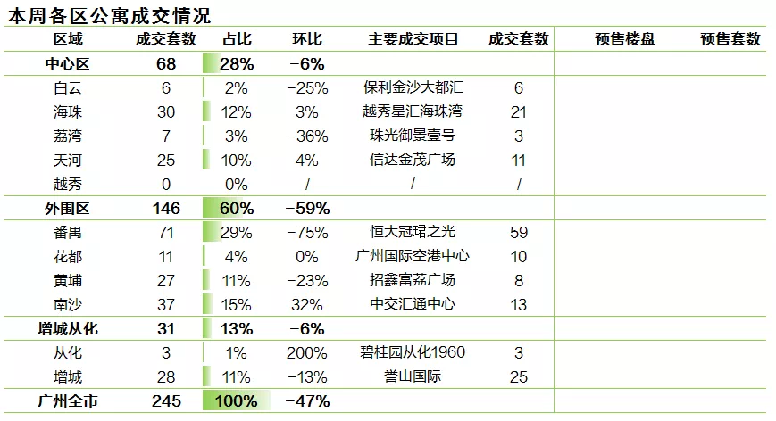 广州公寓市场连续五周零新增供应,而本周市场成交回落至常态。全市共成交245套公寓,相比上周因大宗交易拉升的成交量下跌47%。主力区番禺继上周录得大宗交易后,本周公寓成交量依然先进,成交71套。该区恒大冠珺之光近期推出“首期2.5万起+75折的限时优惠”,项目本周跑量59套25-95㎡的轻奢公寓。南沙区成交量环比上涨32%,主力贡献来自中交汇通中心、敏捷尚品国际,前者主推2字头的海景公寓,本周成交13套。而黄埔、花都区以在售热盘或旧盘的少量交易为主。增城区誉山国际新品公寓持续销售,本周以25套的销量位居榜单第二。中心区表现相对活跃的为海珠区越秀星汇海珠湾,项目近期加推高层47-79㎡的瞰江LOFT公寓,总价160万元起,本周共成交21套