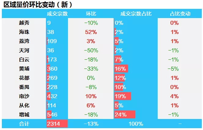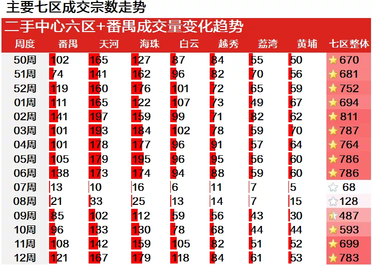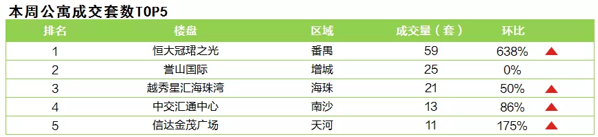 在主要七区中,本周多区成交量较上周相比有明显回升,其中荔湾、天河、海珠三区整体表现亮眼。本周三区分别成交61宗、167宗、179宗,环比上涨19.6%、17.6%、12.6%。但需要指出的是,本周海珠区需求依旧活跃,共成交179宗,环比上涨12.4%,稳居各区榜首位置。