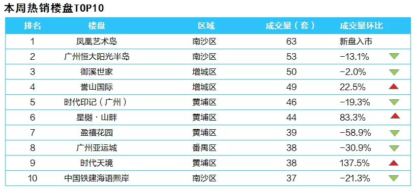本周南沙区成交表现抢眼,累计成交432宗,环比增加10%,仅次于增城为本周广州成交第二大区,南沙成交表现强势主要得益于3月以来多个项目开盘/加推,如3月初开盘的华宇凤凰艺术岛,本周网签63宗,为区域成交排名前列大盘。此外金洲中铁建海语熙岸、黄阁南沙·十里方圆等加推项目成交不俗,买家对于南沙热门板块及地铁沿线项目关注度较高。