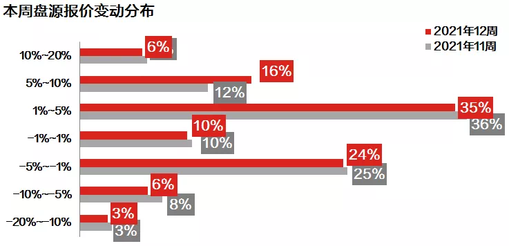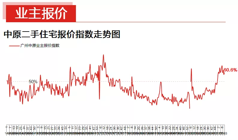 本周业主报价指数为60.6%,环比上周上涨2.2%。目前市场氛围活跃,客户入市热情高,成交周期较之前有所缩短,促使业主对后市信心较强,报价指数上升至60%以上水平。整体看,本周报价下调1%-5%之间的盘源占24.5%,较上周下降0.4%。而报价上调1%-5%以内的盘源占比则较上周下调1.1个百分点,共占34.9%。另外,本周报价上调5%-10%的盘源环比净增4.1个百分点,共占15.9%。