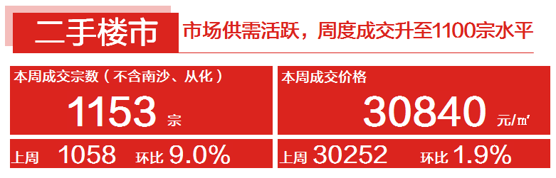 本周二手整体网签宗数为1153宗,环比上涨9.0%,成交已连续5周保持增长态势,周度网签上升至1100宗水平。总体看,目前广州二手楼市交投环境比较活跃,客户入市热情高。另外,业主放盘也明显积极,本周中原录得的新增放盘数量回归千套以上,部分热点板块供不应求的状况有所减缓。价格方面,本周二手住宅网签均价为30840元/平,环比微涨1.9%.