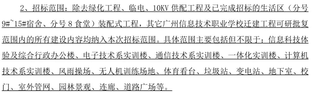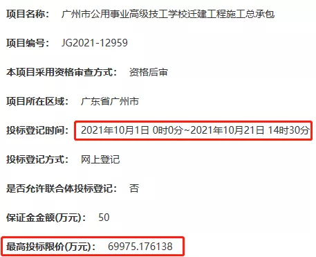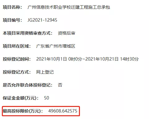·广州信息技术职业学校迁建工程施工总承包据公告所示,本次招标建筑面积约 112046 平方米,较大建筑高度 38.45 米,较高投标限价约为4.96亿元,且不接受联合体报名。