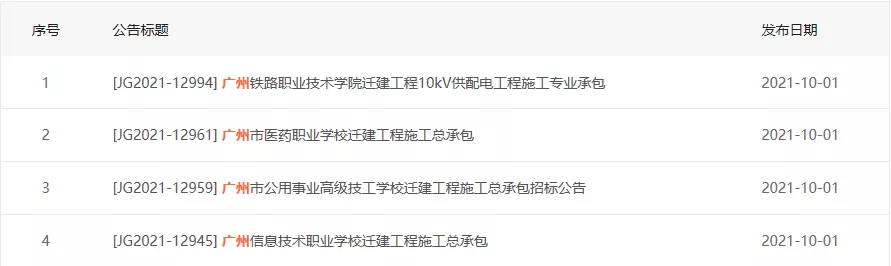 公告截图具体情况如何?一起来看看!15.52亿元科教城内四所院校招标4则招标公告总投标限价为15.52亿元。涉及广州信息技术职业学校、广州市医药职业学校、市公用事业高级技工学校,以及广州铁路职业技术学院。