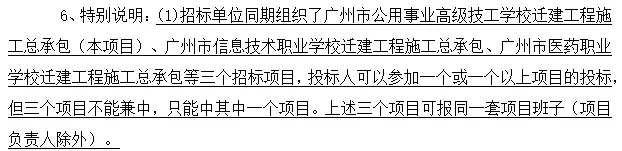 值得关注的是,广州市公用事业高级技工学校迁建工程施工总承包(本项目)、广州市信息技术职业学校迁建工程施工总承包、广州市医药职业学校迁建工程施工总承包等三个招标项目,投标人可以参加一个或一个以上项目的投标,但三个项目不能兼中,只能中其中一个项目。