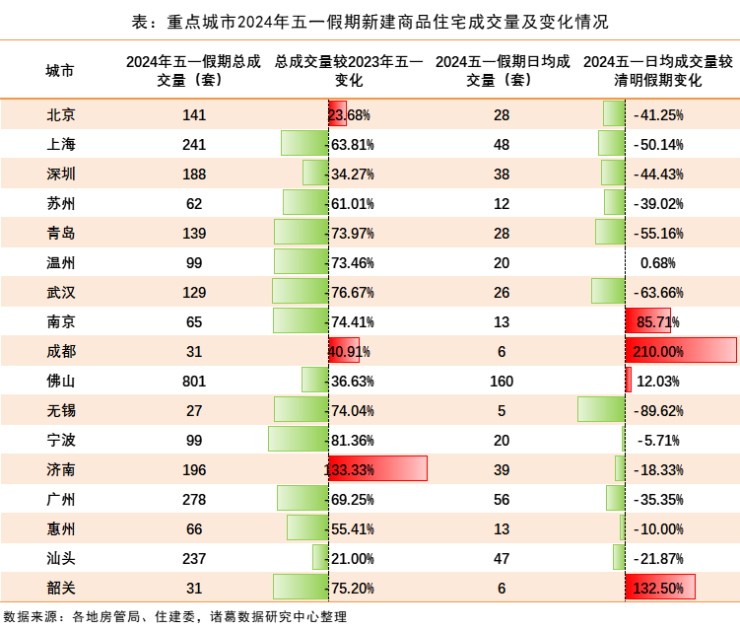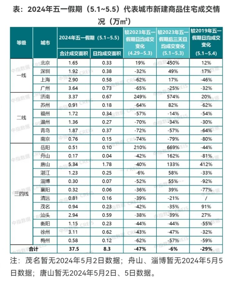 五一期间,12个重点城市新房日均成交425套,降52%;仅北京、济南、成都好于去年