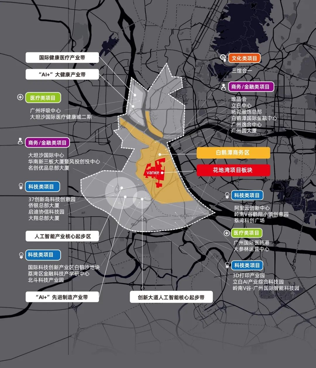 在项目周边,包括阿里云创新中心、唯品会、岭南V谷科技园等智能制造和新零售产业项目,广州呼吸中心、广州国际医药港、大参林运营中心、大翔集团总部大厦等国际大健康项目。