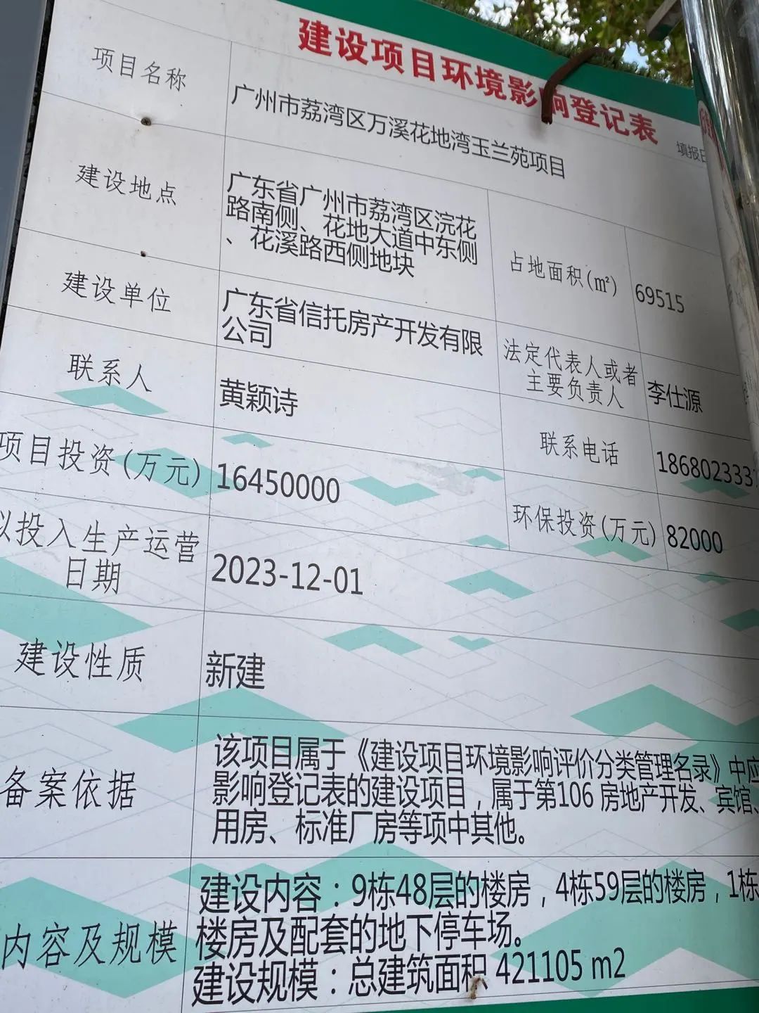 从项目现场的建设环境影响登记表中可以看到,玉兰苑项目占地面积69515㎡,项目投资1645万元。