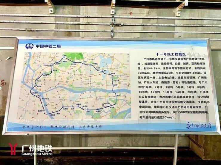 截至目前,地铁十一号线(火车站—琶洲—火车站)车站方面,2座已开通,28座车站已封顶,1座进行土建施工;32个区间已全部贯通;赤沙车辆段及全线车站正在进行机电施工。