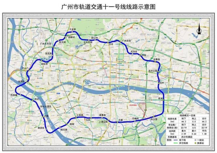 地铁十一号线全长约44.2公里,全部采用地下敷设方式,串联海珠、越秀、荔湾、天河、白云五个区,全线共设车站32座,换乘站26座站,16座与既有线路换乘,是名副其实的“换乘之王”。