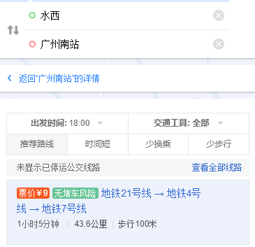 测算一下,目前若从水西、萝岗、大沙东去广州南站,需要各种换乘(2-3次)才能到,耗时1小时起。
