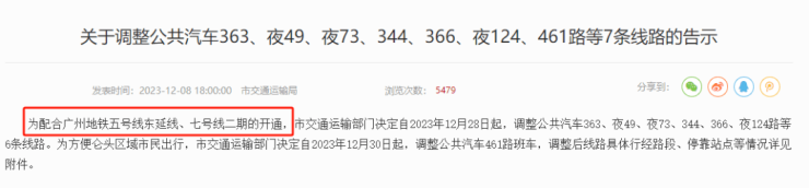 近日,广州市交通运输局官网发布公告,为配合广州地铁五号线东延线、七号线二期的开通,市交通运输部门决定自2023年12月28日起,调整公共汽车363、夜49、夜73、344、366、夜124路等6条线路。