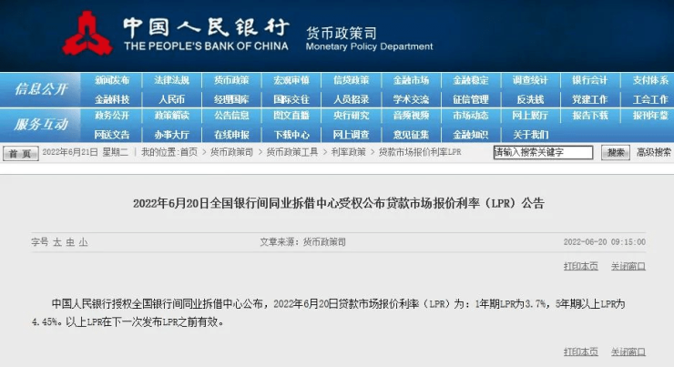 近日,中国人民银行授权全国银行间同业拆借中心公布了较新一期贷款市场报价利率(LPR)——1年期LPR为3.7%,5年期以上LPR为4.45%。均与上月持平。