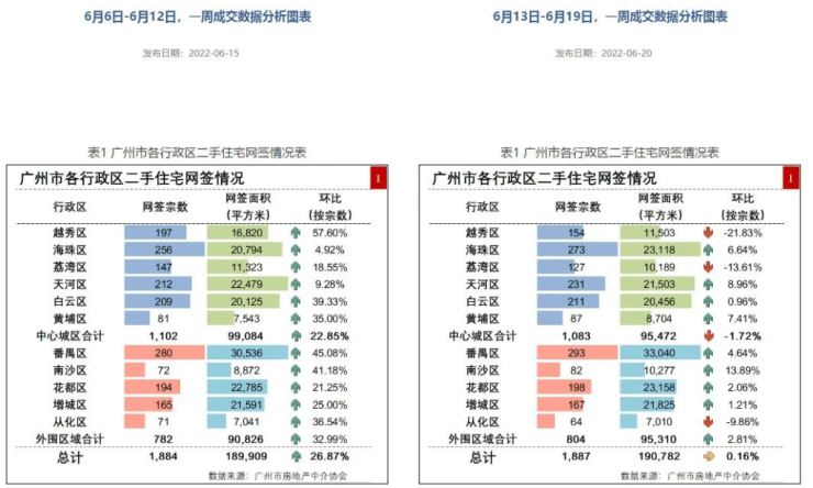 二手楼方面,据广州市房地产中介协会官网公布的较新数据显示,5月30日至6月5日,广州市二手住宅网签1485宗,环比降23.34%;6月6日至6月12日的数据为1884宗,环比提升26.87%;6月13日至6月19日的数据则为1887宗,环比微增0.16%。