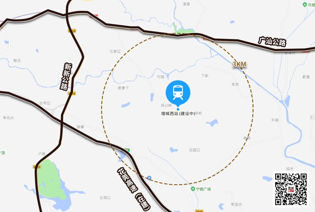 增城西站,位于中新镇南部,距离新新公路的花莞高速路口约4.3公里(直线距离),而广汕公路则距离约有3公里左右(直线距离)。